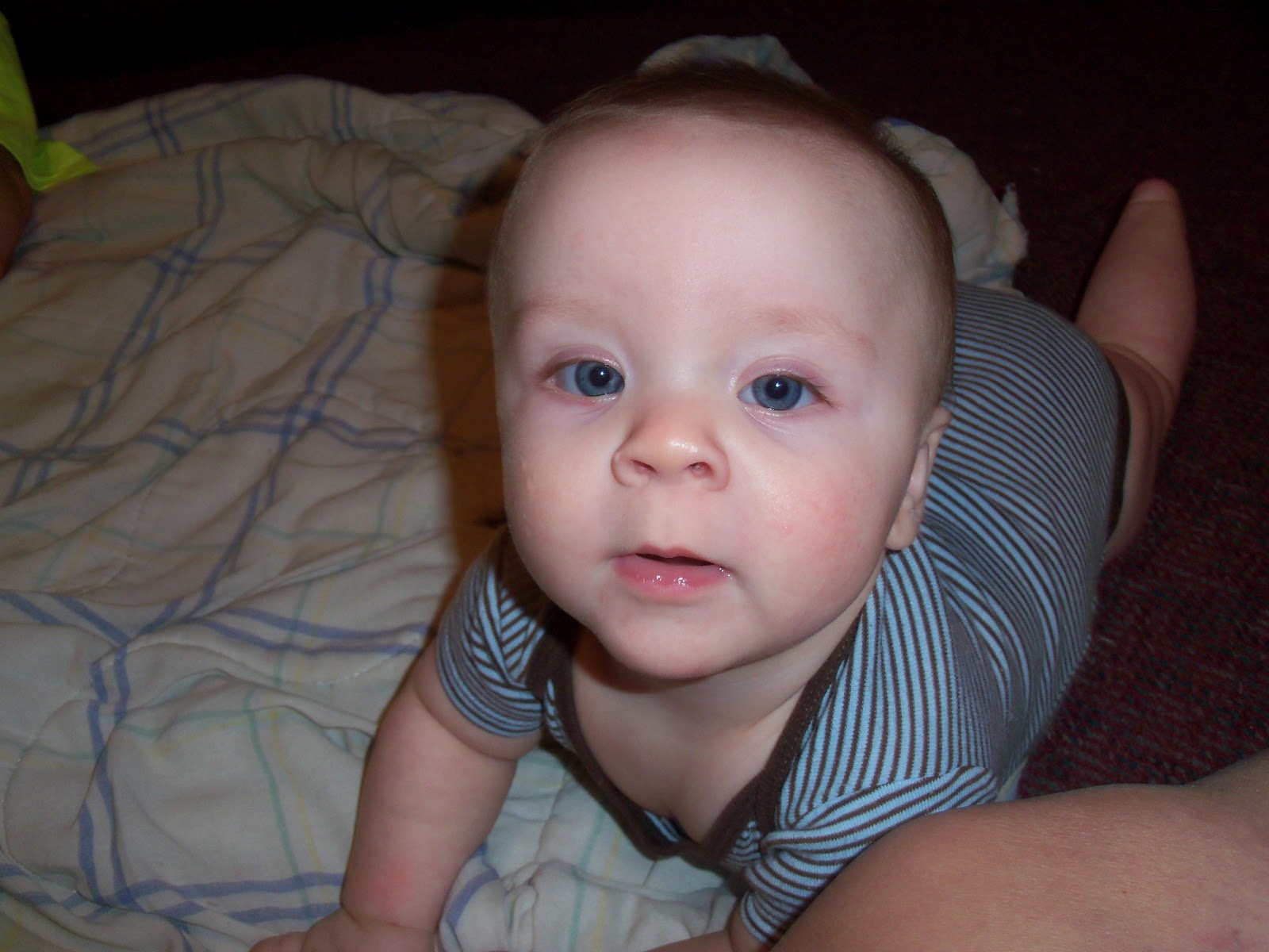Jubal's two bottom teeth have been right below the gums forever. His bottom right one came through Sunday night & his bottom left came on through Monday. I have a picture. It's not real clear, though. It's only of his first tooth, too. Once they come in a little more, I'll post new pics.